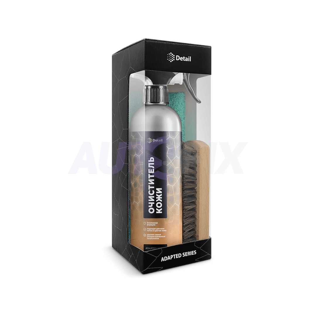 Набор Детейл DT-0510 включает в себя все необходимые инструменты и средства для очистки кожи внутри салона автомобиля. В набор входят: очиститель кожи Leather Clean Adapted Series Detail 500 мл, щетка для очистки кожи, полотенце из микрофибры.